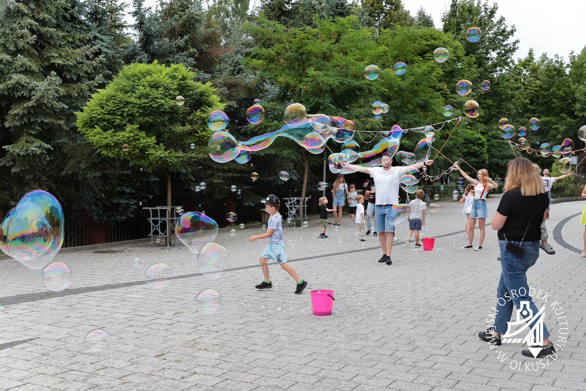 Bańki można było puszczać z ziemi i z niebotycznie wysokich szczudeł. Było też malowanie bańkami. Było bańkowo… bajkowo. Wokół pachniało kosmetycznie płynem.