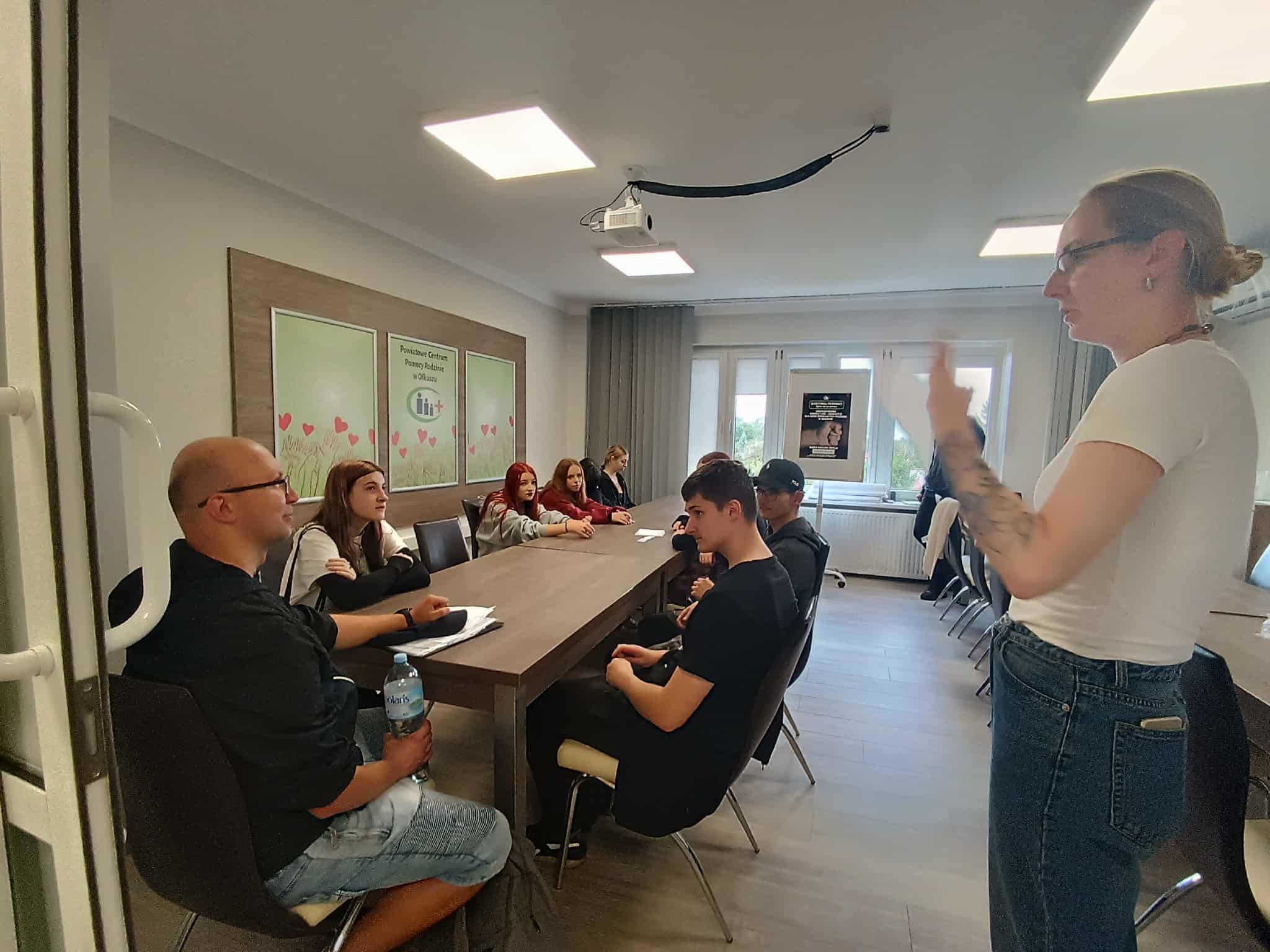 Na rozpoczęcie tego emocjonującego wydarzenia Pani Renata Liwosz – komendant 6-16 HP w Olkuszu przywitała zgromadzonych gości młodzież i nauczycieli Zespołu Szkół nr 4 w Olkuszu a także przedstawicieli instytucji partnerskich; Pana Rafała Czeladzkiego Wicestarostę olkuskiego, Panią Gabrielę Zielińską kierownik Punktu Interwencji Kryzysowej – Powiatowe Centrum Pomocy Rodzinie, Pana Piotra Polaka dyrektora Powiatowego Urzędu Pracy, Panów asp. Kamila Lisowskiego oraz Bartosza Ziarnika z Komendy Powiatowej Policji, Pana inspektora Bogdana Salawę oraz Panią radcę Agnieszkę Liptak z Okręgowego Inspektoratu Pracy w Krakowie – Państwowa Inspekcja Pracy, Panią Beatę Dąbrowę kierownik Cechu Rzemiosł Różnych, Panią Angelikę Postawę doradcę zawodowego oraz Panią Anetę Wójcik Specjalistę ds. zatrudnienia z Centrum Edukacji i Pracy Młodzieży w Krakowie.