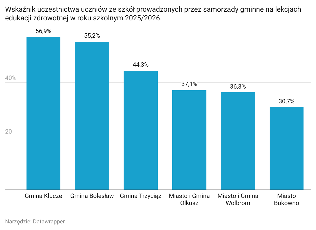 Najwyższy poziom uczestnictwa odnotowano w Gminie Klucze, gdzie na zajęcia uczęszcza 378 uczniów (56,9% wszystkich). W Gminie Bolesław udział w lekcjach zadeklarowało 186 uczniów (55,2%), a w Gminie Trzyciąż – 148 uczniów (44,3%). Niższe wskaźniki frekwencji odnotowano w większych gminach, obejmujących zarówno miasta, jak i okoliczne wsie. W gminie Olkusz uczestniczy 768 uczniów (37,1%), w Wolbromiu – 377 uczniów (36,3%), a w Bukownie jedynie 114 uczniów (30,7%). Oznacza to, że w mniejszych gminach wiejskich edukacja zdrowotna spotkała się z wyraźnie większym zainteresowaniem niż w szkołach położonych w bardziej zurbanizowanych miejscowościach.