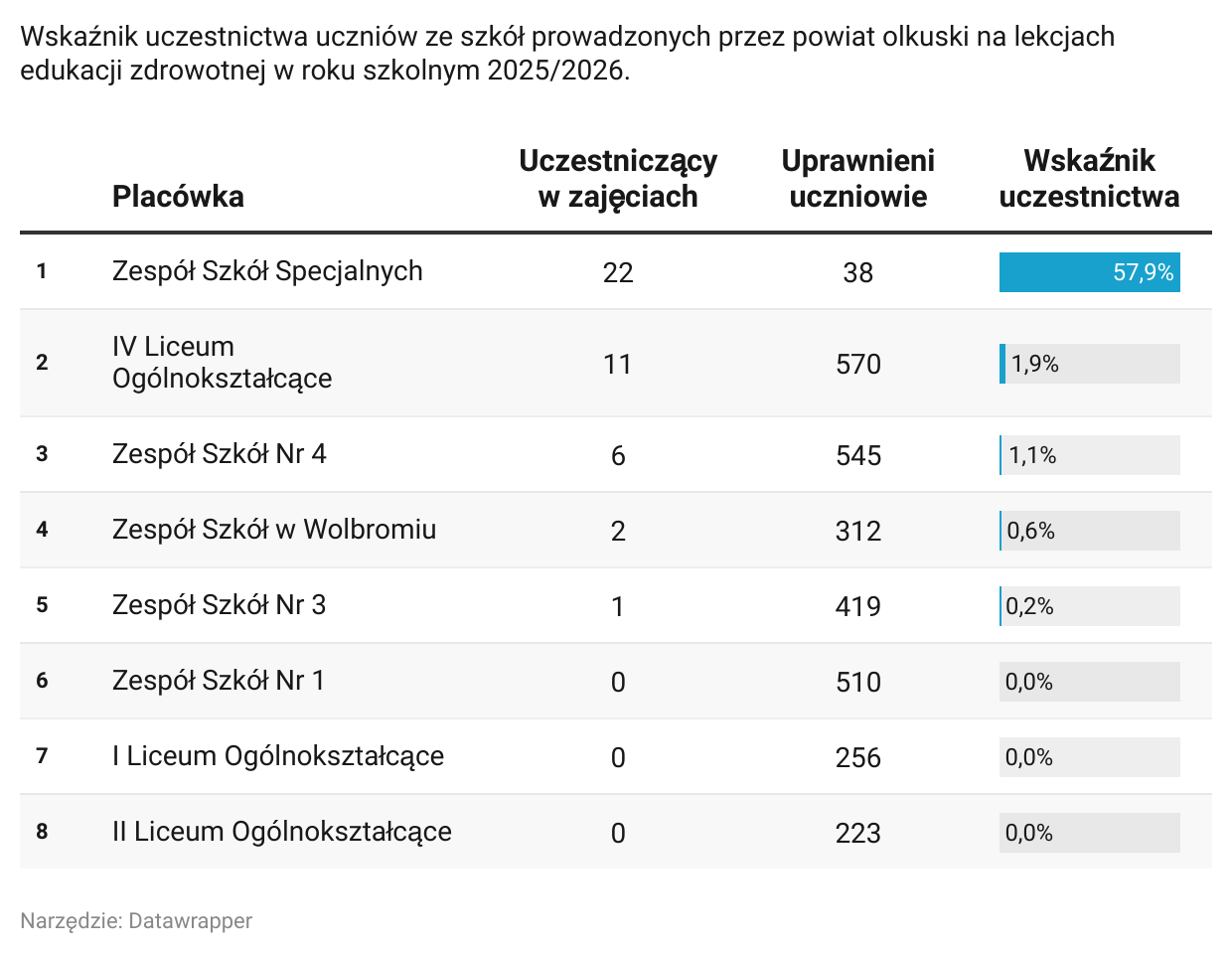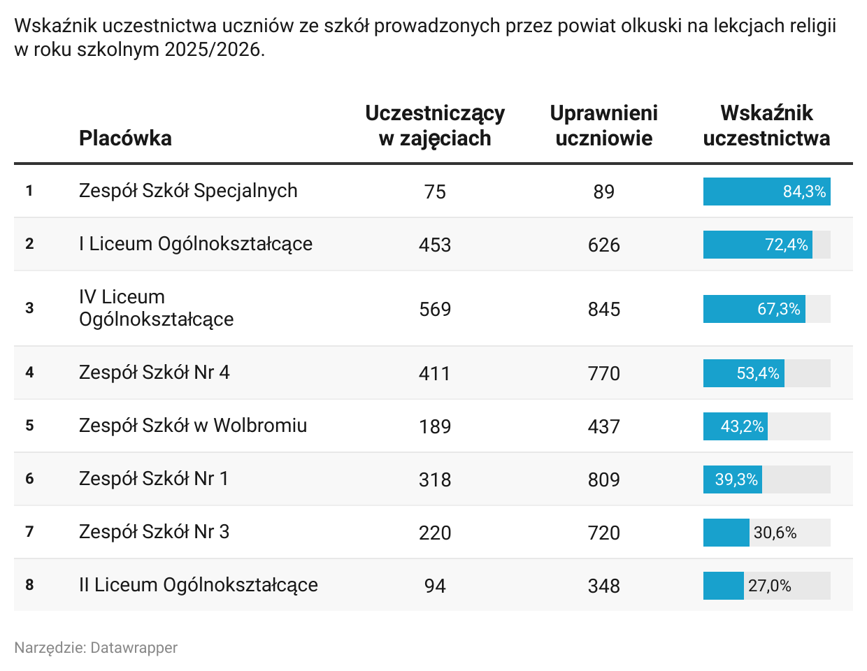 Największe zainteresowanie odnotowano w Zespole Szkół Specjalnych, gdzie w zajęciach uczestniczy 22 uczniów (57,9%), a 16 (42,1%) z nich zrezygnowało. W IV Liceum Ogólnokształcącym lekcje wybrało 11 uczniów (1,9%), podczas gdy 559 osób (98,1%) nie bierze w nich udziału. W Zespole Szkół nr 4 uczestniczy 6 uczniów (1,1%), a 539 (98,9%) zrezygnowało. W Zespole Szkół w Wolbromiu uczęszczają 2 osoby (0,6%), a 310 (99,4%) nie uczęszcza. W Zespole Szkół nr 3 tylko jedna osoba (0,2%) bierze udział w zajęciach, podczas gdy 418 (99,8%) zrezygnowało. W Zespole Szkół nr 1, I LO i II LO nie zapisał się żaden uczeń – frekwencja wynosi 0%.