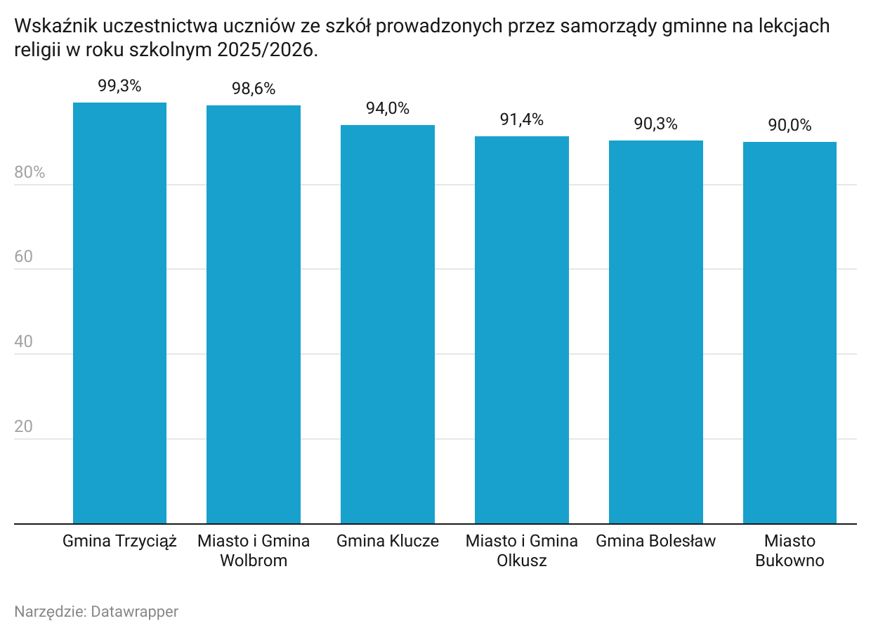 W szkołach podstawowych i zespołach szkolno-przedszkolnych lekcje religii pozostają niemal powszechne. W Gminie Trzyciąż uczęszcza na nie 567 uczniów (99,3%), a tylko 4 osoby (0,7%) zrezygnowały. W Wolbromiu frekwencja wynosi 98,6% (1819 uczniów uczestniczy, 25 nie), w Gminie Klucze – 94% (1090 uczniów wobec 69 rezygnujących), w Olkuszu – 91,4% (3523 uczestników, 331 nie), w Bolesławiu – 90,3% (477 wobec 51), a w Bukownie – 90% (550 wobec 61).