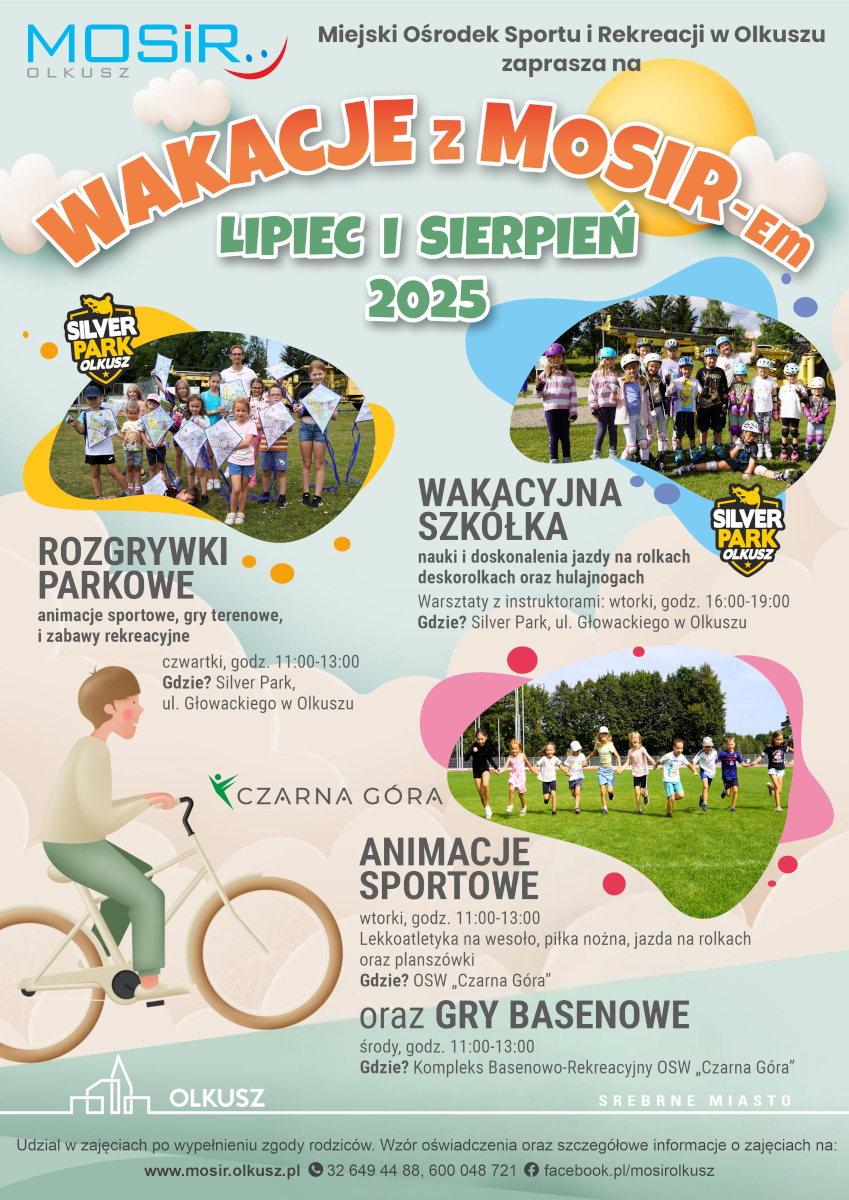 Tradycyjnie, program „Wakacji z MOSiR-em” został podzielony na bloki tematyczne, składające się z różnych aktywności sportowo-rekreacyjnych: na chętnych czekają rozgrywki parkowe w Parku Rekreacyjno-Krajobrazowym „Silver Park” w Olkuszu, animacje sportowe w Ośrodku Sportowo-Wypoczynkowym „Czarna Góra” w Olkuszu, gry basenowe w Kompleksie Basenowo-Rekreacyjnym w Ośrodku Sportowo-Wypoczynkowym „Czarna Góra” w Olkuszu czy wakacyjna szkółka nauki oraz doskonalenia jazdy na rolkach, deskorolkach i hulajnogach w Parku Rekreacyjno-Krajobrazowym „Silver Park” w Olkuszu. Udział we wszystkich zajęciach również jest bezpłatny! Szczegółowe informacje dostępne są na stronie internetowej Miejskiego Ośrodka Sportu i Rekreacji w Olkuszu.
