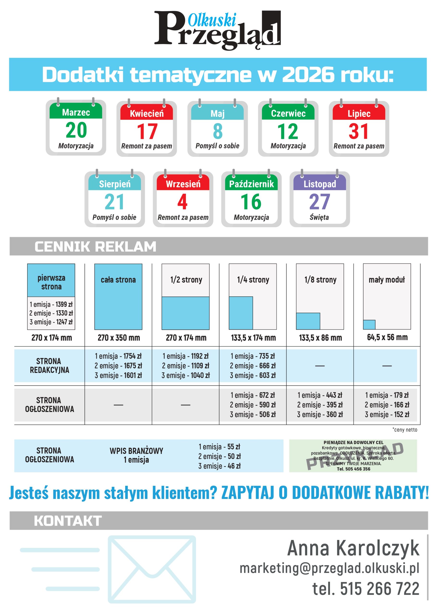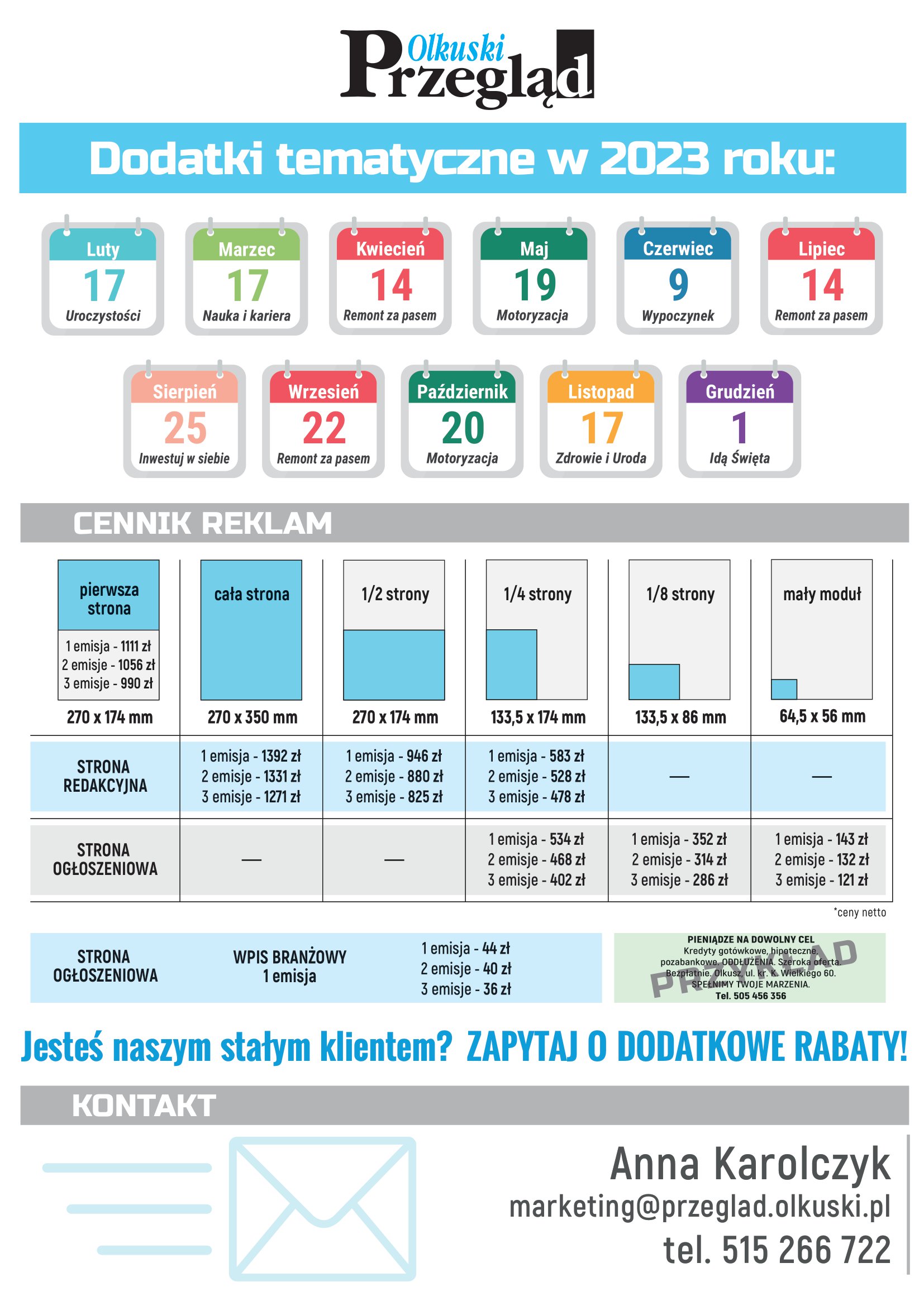 Anna Karolczyk: tel. 515 266 722 email: marketing@przeglad.olkuski.pl
