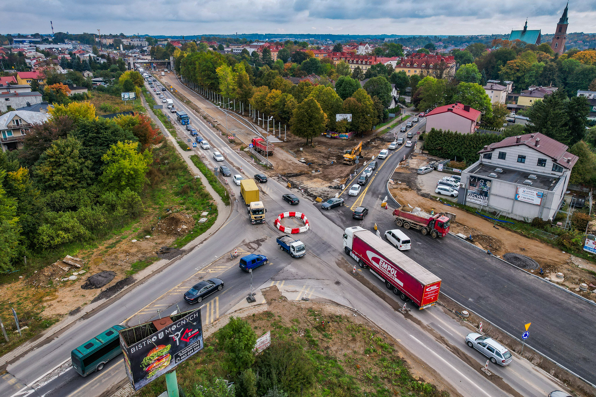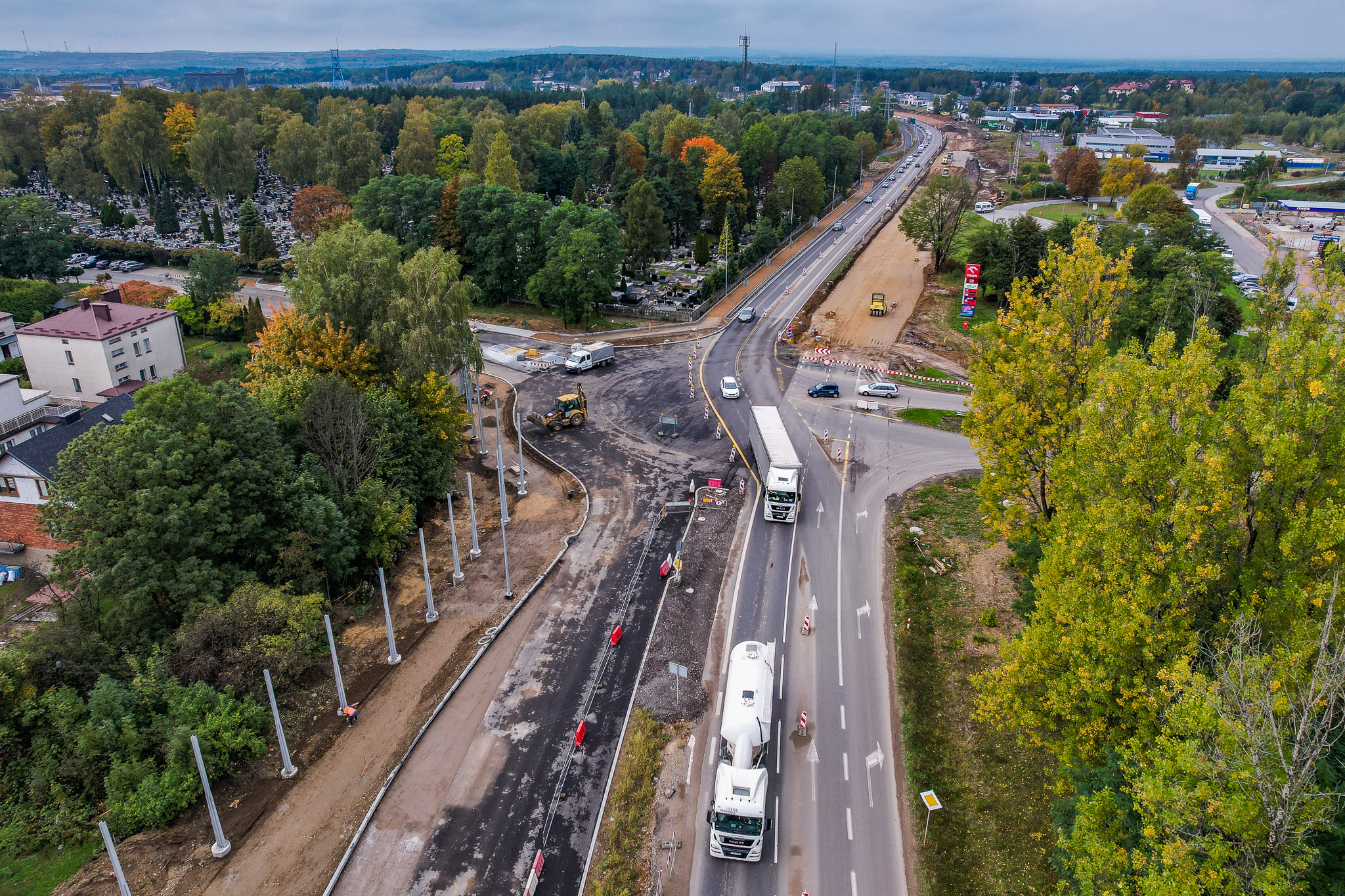 Według najnowszych danych GDDKiA z 9 października 2025 r., zaawansowanie finansowe inwestycji wynosi 52,86 procent. Postęp robót drogowych szacowany jest na 58,2 procent, w branży konstrukcyjno–inżynierskiej – 16,6 procent, sanitarnej – 72 procent, elektrotechnicznej – 29,95 procent, teletechnicznej – 53,23 procent, a w zakresie zieleni – 39,4 procent. Na placu budowy praca wre: trwa wypełnianie pustek krasowych, budowa kanalizacji deszczowej oraz przebudowa sieci gazowej i wodociągowej. Prowadzone są też roboty przy infrastrukturze energetycznej i oświetleniu drogowym, a także prace ziemne i brukarskie. Wykonawca kontynuuje budowę przejścia podziemnego dla pieszych oraz nowej kładki nad drogą, gdzie prowadzone jest zbrojenie, betonowanie i montaż elementów nośnych. Równocześnie powstają kolejne odcinki murów oporowych i ekranów akustycznych, które mają chronić okolicznych mieszkańców przed hałasem.
