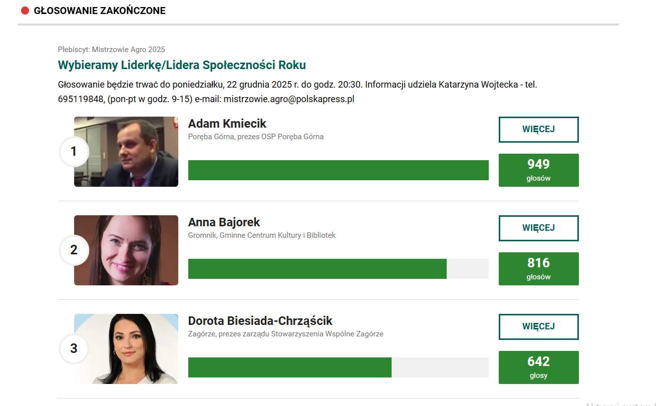 Prezes Ochotniczej Straży Pożarnej w Porębie Górnej, Adam Kmiecik, zdobył pierwsze miejsce w plebiscycie Mistrzowie Agro 2025 w kategorii Lider Społeczności Lokalnej. Zwyciężył zdobywając aż 949 głosów. W swojej działalności społecznej skupia się na aktywizacji mieszkańców i stawia na ścisłą współpracę z lokalnymi organizacjami. Laureat postrzega nagrodę jako wyraz docenienia całej wspólnoty zaznaczając, że: „To wyróżnienie nie jest indywidualnym sukcesem, lecz docenieniem wspólnej pracy wielu osób zaangażowanych w życie lokalnej społeczności”. Przyznany mu tytuł stanowi dla niego motywację do kontynuowania misji budowania silnej i zintegrowanej wsi.