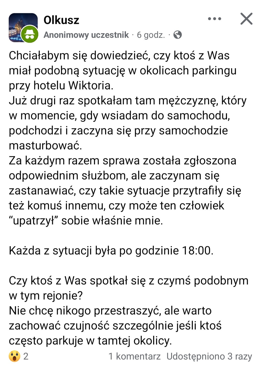 Na jednej z lokalnych grup na Facebooku pojawił się post, który w krótkim czasie wzbudził duże poruszenie. Jego autorka opisała sytuację, do której miało dojść na parkingu przy hotelu zlokalizowanym nieopodal ul. Mickiewicza: Chciałabym się dowiedzieć, czy ktoś z was miał podobną sytuację. Już drugi raz spotkałam tam mężczyznę, który w momencie, gdy wsiadam do samochodu, podchodzi i zaczyna się przy samochodzie masturbować. Za każdym razem sprawa została zgłoszona odpowiednim służbom, ale zaczynam się zastanawiać, czy takie sytuacje przytrafiły się też komuś innemu, czy może ten człowiek upatrzył sobie właśnie mnie. Każda z sytuacji była po godzinie 18:00.