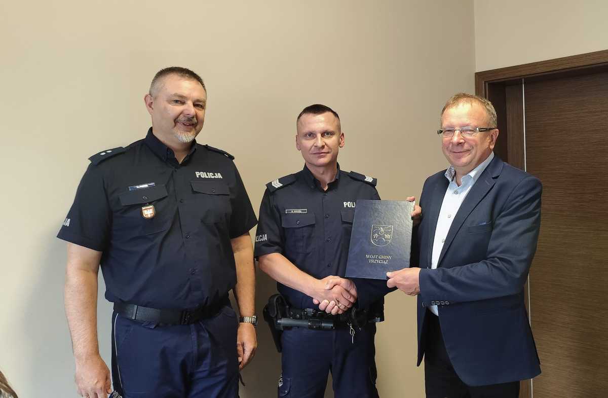 Dzielnicowy z Gminy Trzyciąż, wraz z Komendantem Komisariatu Policji w Wolbromiu, gościli w Urzędzie Gminy w Trzyciążu na zaproszenie Wójta Gminy Trzyciąż Romana Żelaznego: włodarz docenił wysiłki sierż. szt. Mariusza Magierę oraz wręczył mu pamiątkowy dyplom w uznaniu za jego starania na rzecz poprawy bezpieczeństwa mieszkańców gminy. Komendant Komisariatu Policji w Wolbromiu podziękował natomiast wójtowi Żelaznemu za trudy, jakie podejmuje wraz z lokalnym samorządem, aby wspierać wolbromską Policję.