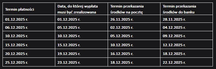 Termin wypłat emerytur i rent w grudniu 2025 r. oraz terminy przekazania środków na pocztę i do banku.